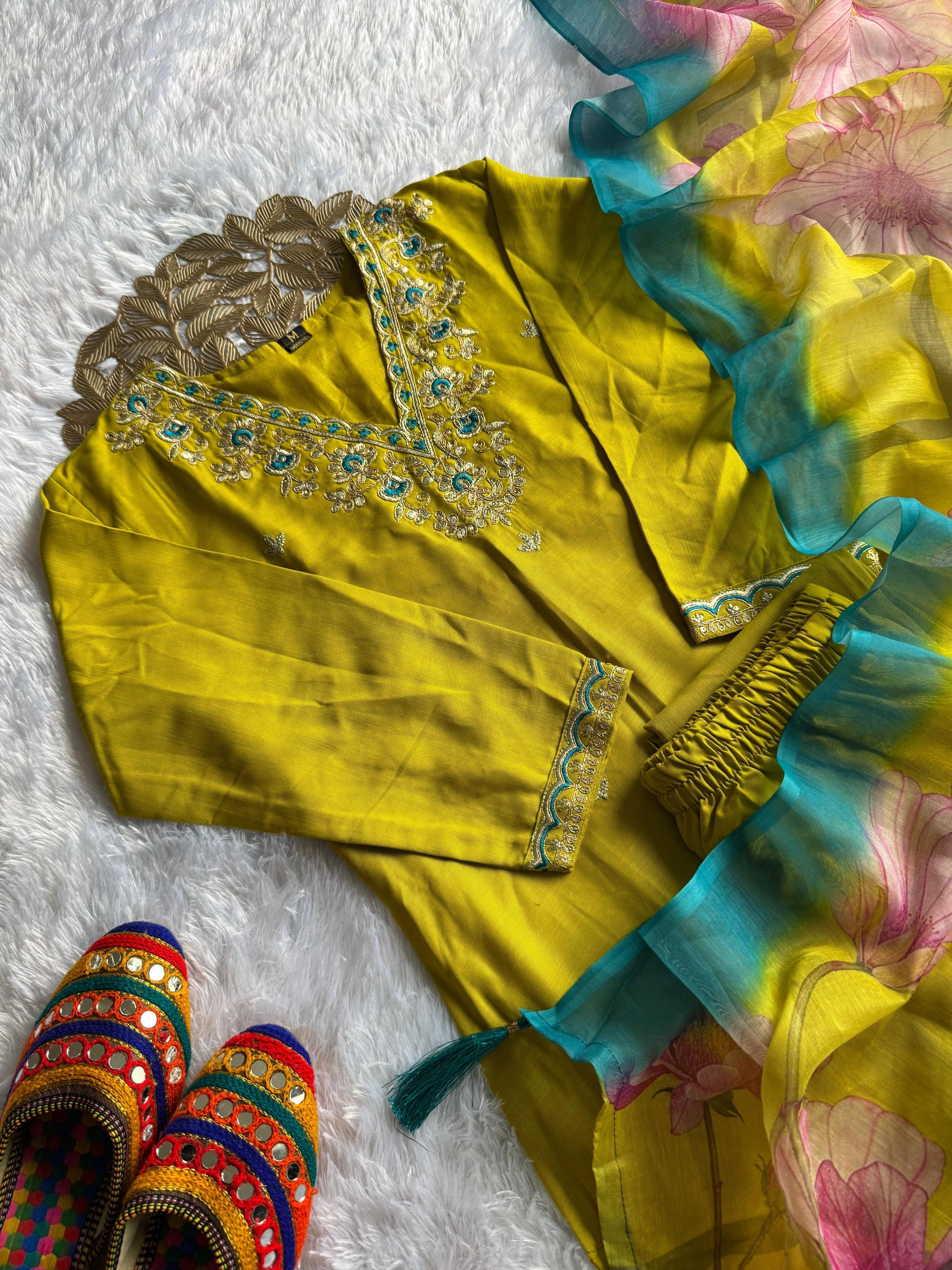Kayatri New Designer Reyon Slub Kurti Pant Suit Dupatta Set with Embroidery Chanderi Dupatta