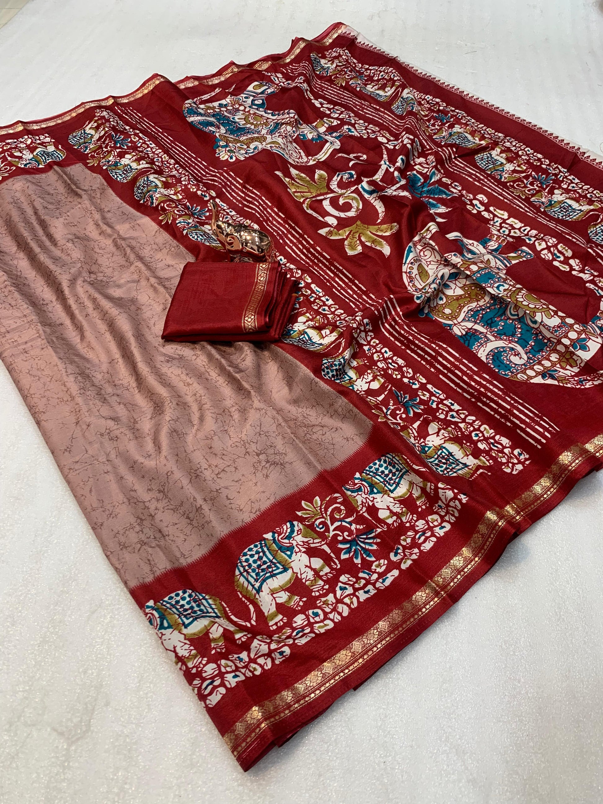 Kayatri New Premium Dola Silk Saree with Kalamkari Prints Designer Contrast Blouse