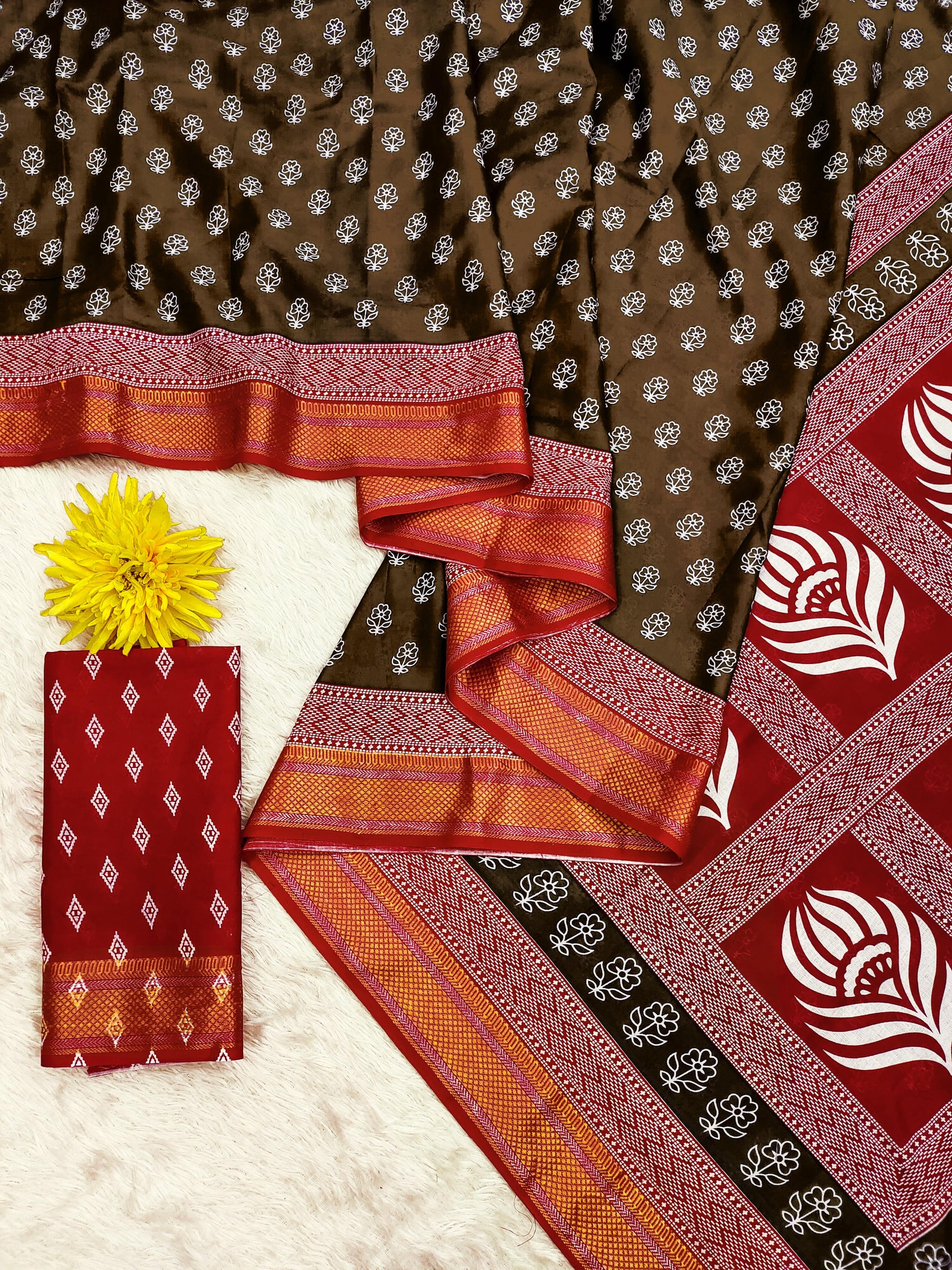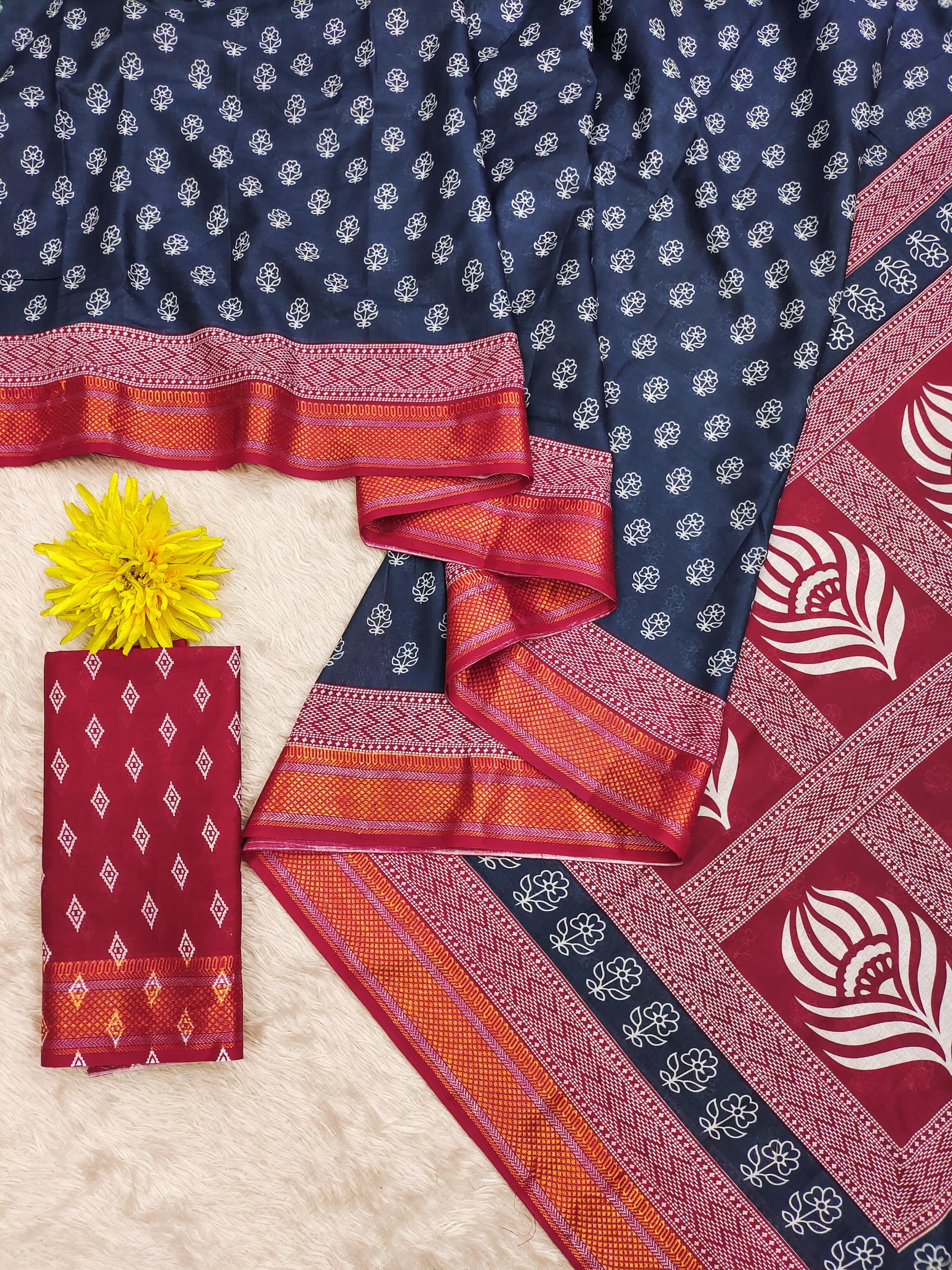 Kayatri New Pure Mulmul Cotton Hand Block Print Saree with Heavy Zari Border & Bandhani Blouse